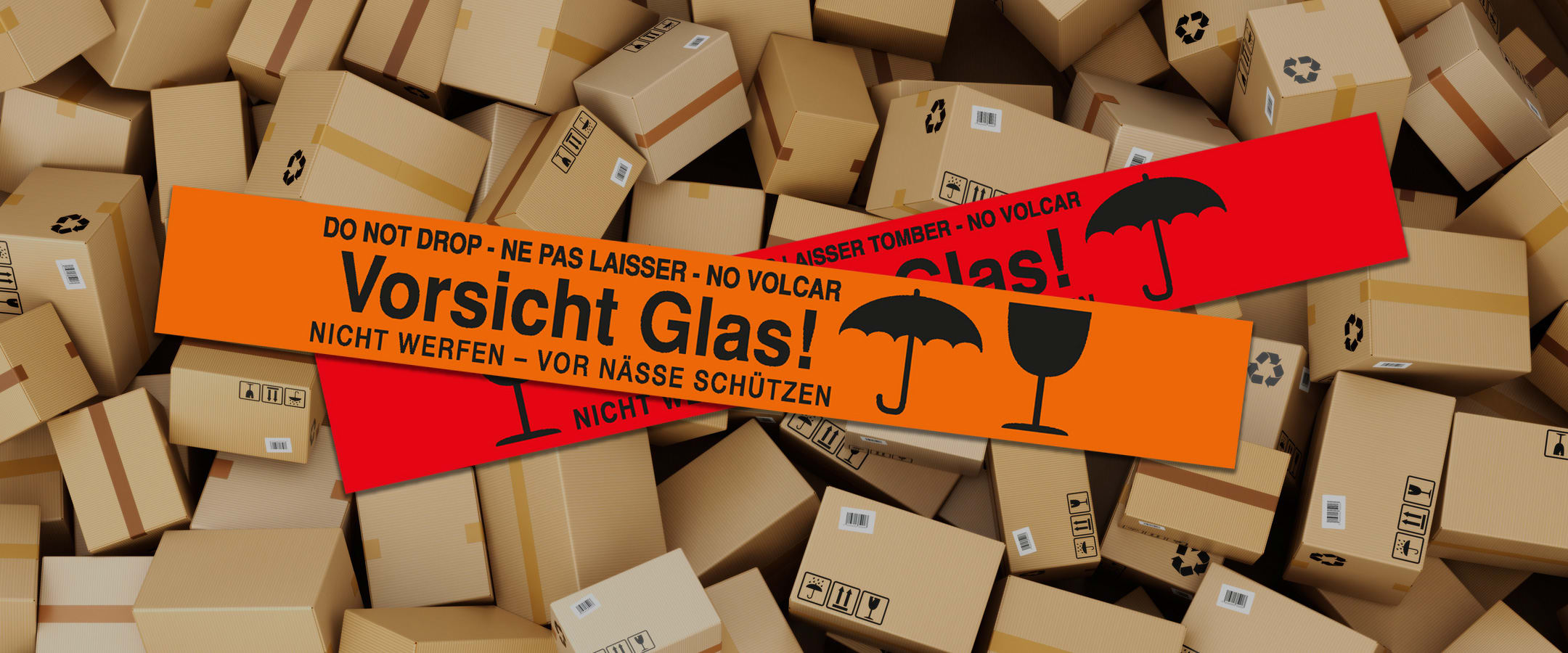 Warnklebeband: Ein spezielles Warnklebeband mit dem Aufdruck „Vorsicht Glas“ weist auf den empfindlichen Inhalt des Pakets hin. Dadurch können Transportmitarbeiter das Paket vorsichtiger behandeln.